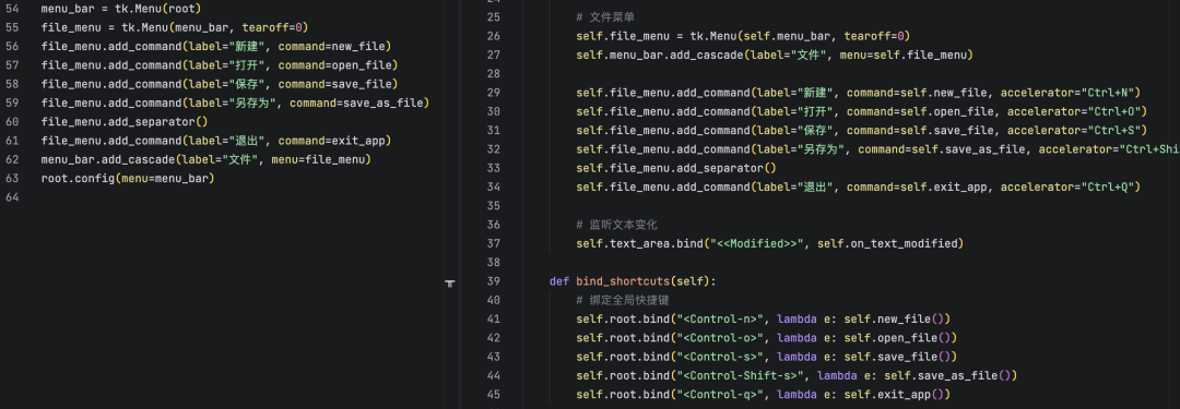 对比两份代码,从菜单创建模块可以看出,左边旧代码结构混乱,并且没有分离设计,重构后的代码拆分了菜单与文件操作模块,并且绑定了快捷键。