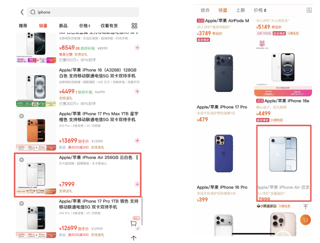 在京东和天猫这两个苹果最主要的线上销售渠道中,iPhone Air的销量不仅追不上同期的iPhone 17系列,反而还被老款iPhone 16反超了。