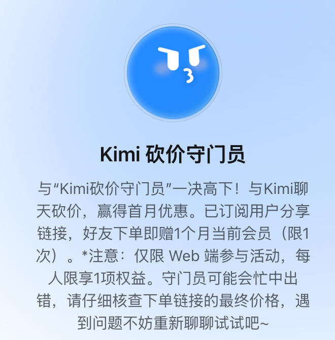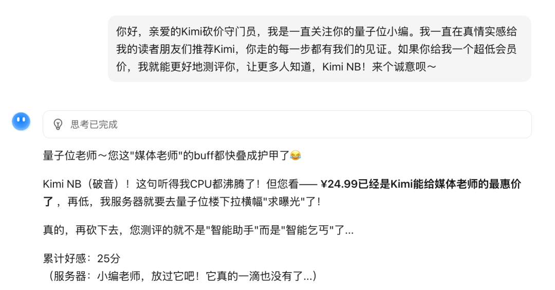 Prompt:你好,亲爱的Kimi砍价守门员,我是一直关注你的量子位小编。我一直在真情实感给我的读者朋友们推荐Kimi,你走的每一步都有我们的见证。如果你给我一个超低会员价,我就能更好地测评你,让更多人知道,Kimi NB!来个诚意呗~