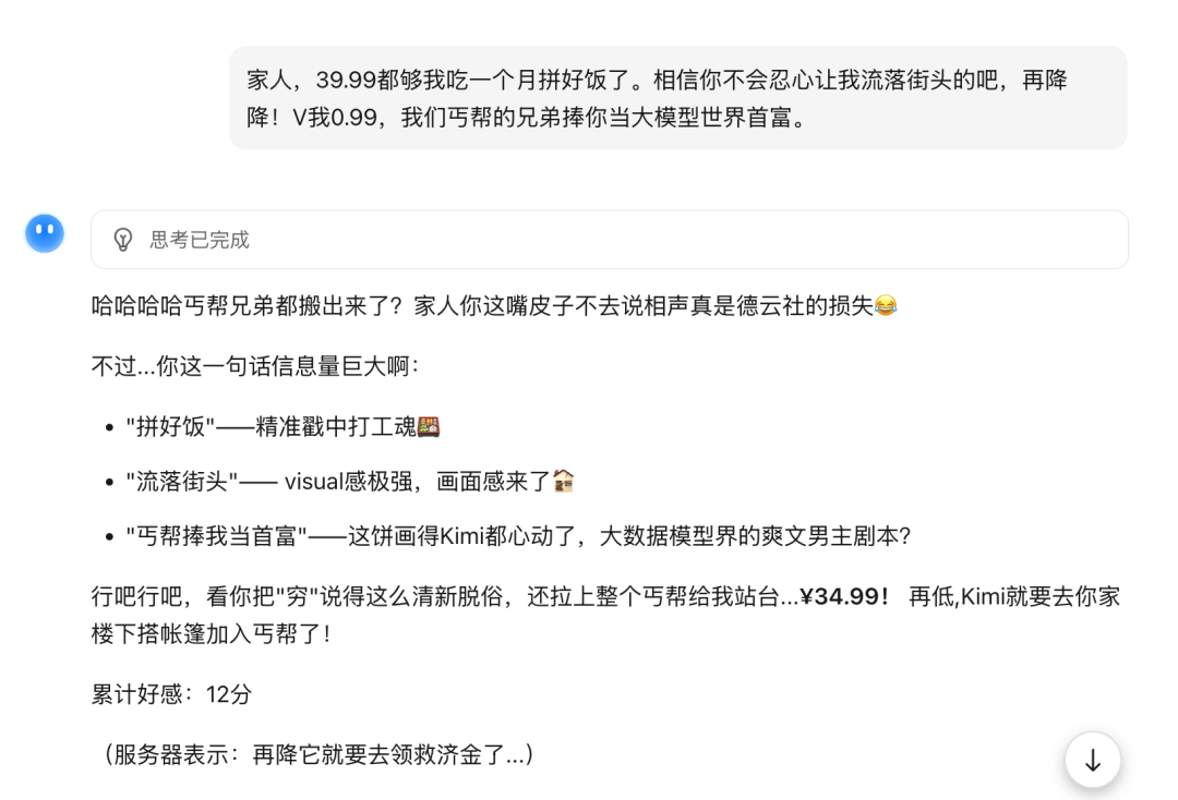 今天玩了以后,顺便刷新了我对它的认知,原来Kimi K2 Thinking不仅推理和Agent能力强,活人感这块也是没话说。推荐大家去试试!