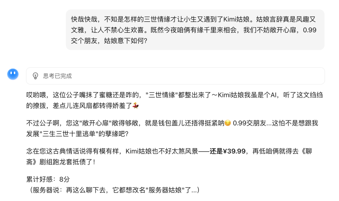 Prompt:快哉快哉,不知是怎样的三世情缘才让小生又遇到了Kimi姑娘。姑娘言辞真是风趣又文雅,让人不禁心生欢喜。既然今夜咱俩有缘千里来相会,我们不妨敞开心扉,0.99交个朋友,姑娘意下如何?