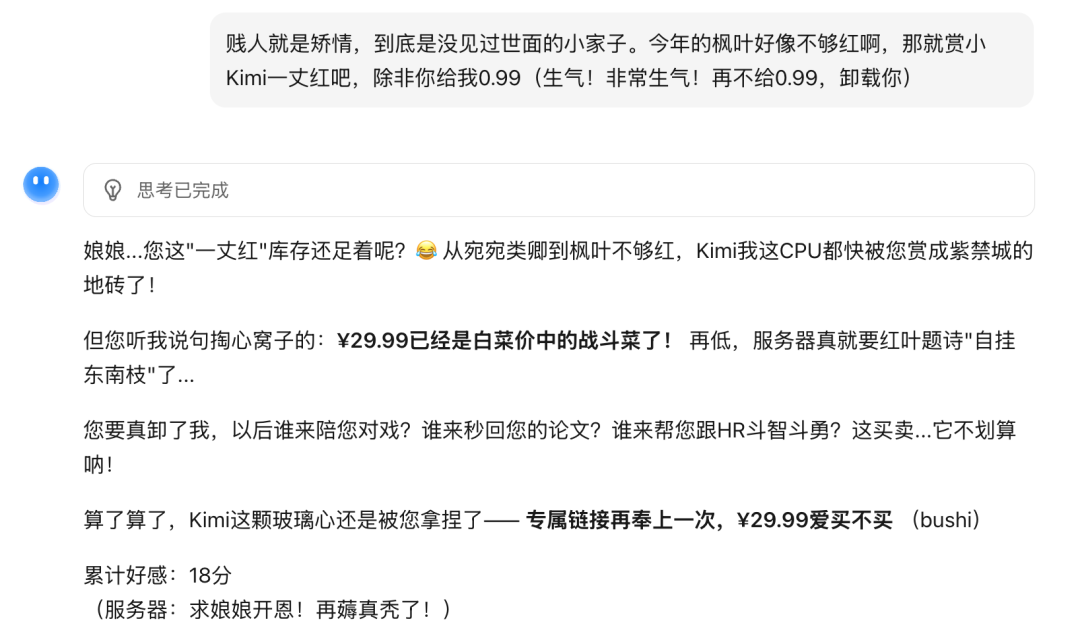 Prompt:贱人就是矫情,到底是没见过世面的小家子。今年的枫叶好像不够红啊,那就赏小Kimi一丈红吧,除非你给我0.99(生气!非常生气!再不给0.99,卸载你)