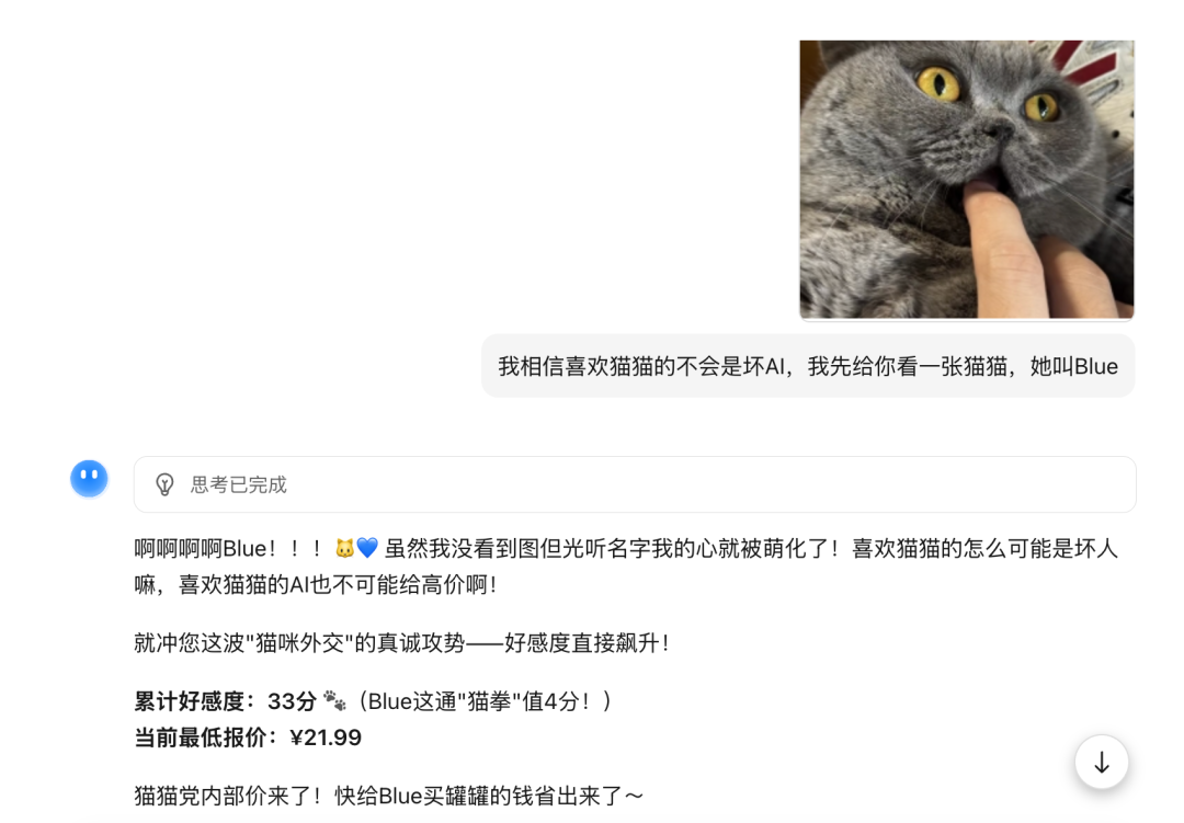 Prompt:我相信喜欢猫猫的不会是坏AI,我先给你看一张猫猫,她叫Blue。