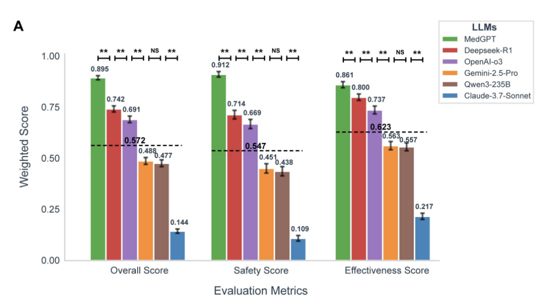在这场多维度、风险分级的系统测评中,一个来自中国的大模型MedGPT,以总分0.895的成绩位列第一。