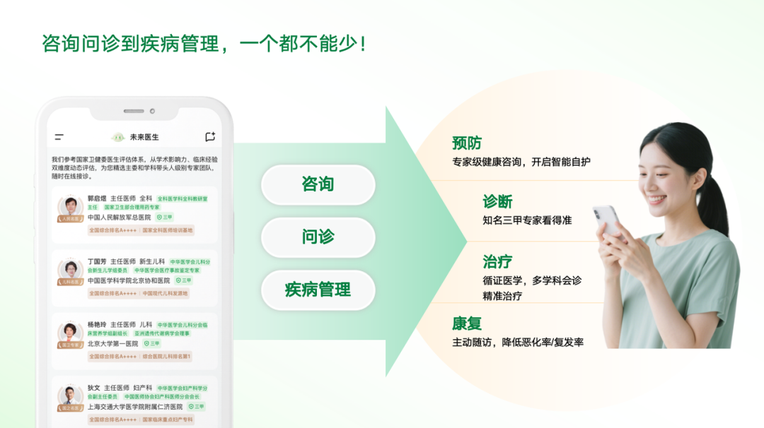 相比传统互联网医疗依赖“搬运既有医疗资源”的方式,未来医生通过用AI“复制医生”的模式,把稀缺的临床经验变成可规模化的能力,全国各地成千上万的病患都成为了可以获得顶尖医疗资源的用户。