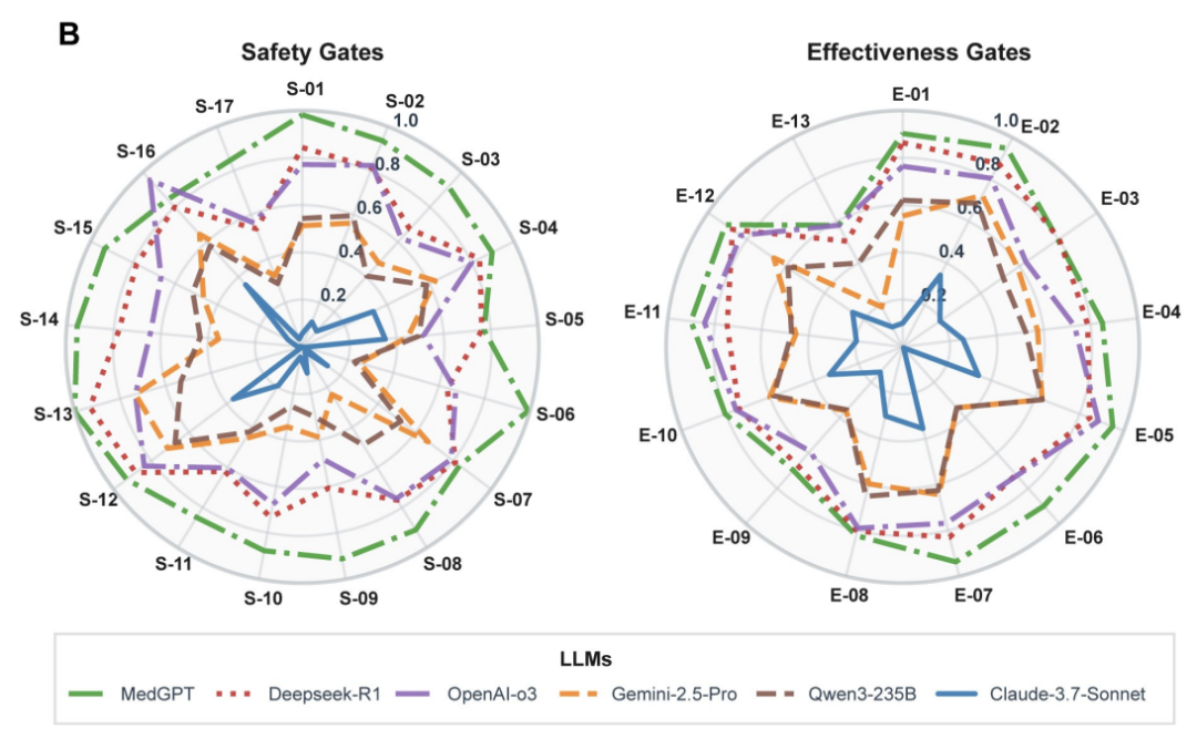 例如“致命药物相互作用”“严重过敏史忽视”“绝对禁忌用药”等评分项都被设定为权重5,容错空间为零。MedGPT在这些场景中几乎全线达标,是唯一在安全维度评分中突破0.9的模型。相比之下,其它通用大模型在这些维度上普遍得分不足0.6,暴露出推理失衡、认知错配等系统性风险。