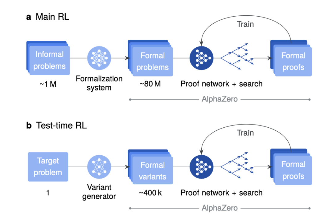 在主强化学习循环中,约100万道非正式数学问题首先经过形式化系统的处理,被翻译成大约8000万道Lean能够理解的形式化问题。证明网络配合树搜索算法在Lean环境中不断尝试,无论是成功找到证明、找到反证,还是超时失败,每一次尝试都会产生经验数据反馈给学习系统。