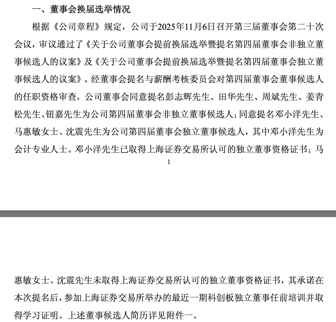 与要约收购结果公告同时发布的,还有上纬新材关于董事会提前换届选举的公告 ,彭志辉(“稚晖君”)等八人为董事候选人。