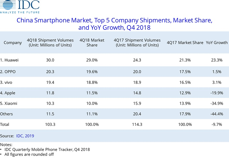 2018年第四季度,国内智能手机市场风云突变。IDC数据显示,华为、OPPO、vivo等国产品牌均在增长,但小米却在经历了高速增长后,出货量严重下滑。