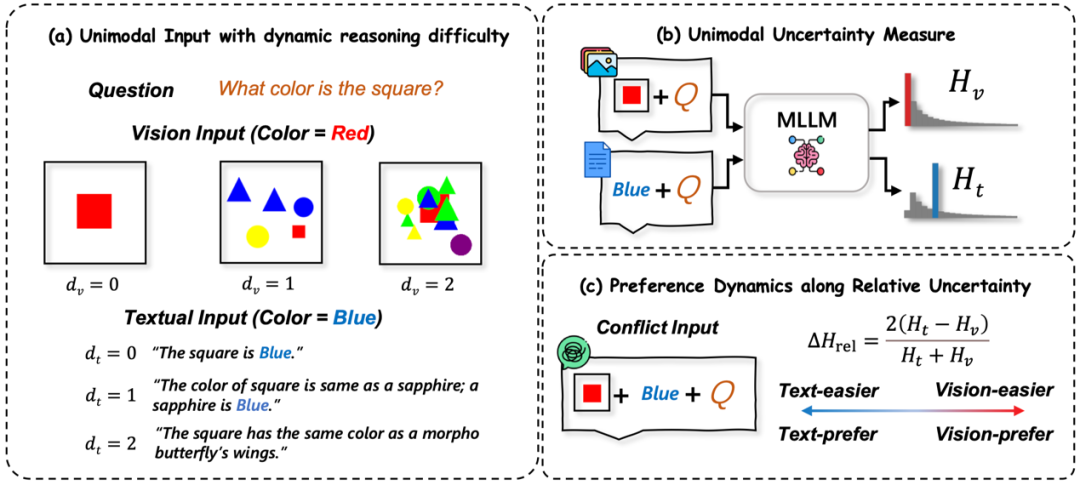 本文通过提出一个新框架,将模态跟随重新定义为“相对推理不确定性”和“固有模态偏好”共同作用的动态过程。研究揭示了一条稳健的法则:模型跟随一个模态的可能性,会随着其相对不确定性的增加而单调下降。同时,“平衡点”为此固有偏好提供了原则性的度量。