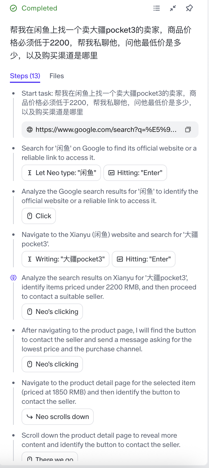 过了大概10分钟,FlowithOS最终成功锁定了闲鱼上一位标价1850元的卖家,并成功把价格砍到了1750元:
