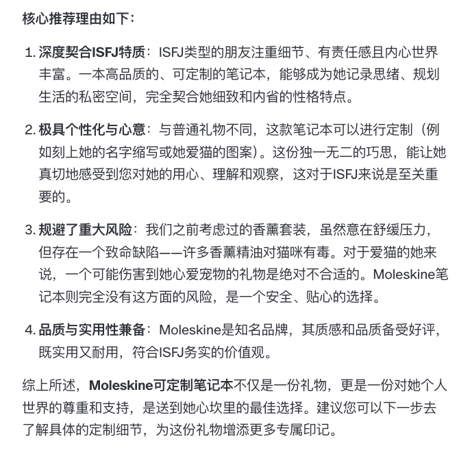 大家看第三点,Agent在筛选完香薰后,留意到很多香薰可能会对猫咪有毒,所以最终才选择了能diy定制的笔记本,而且笔记本本身也符合isfj内心细腻又务实的特点。