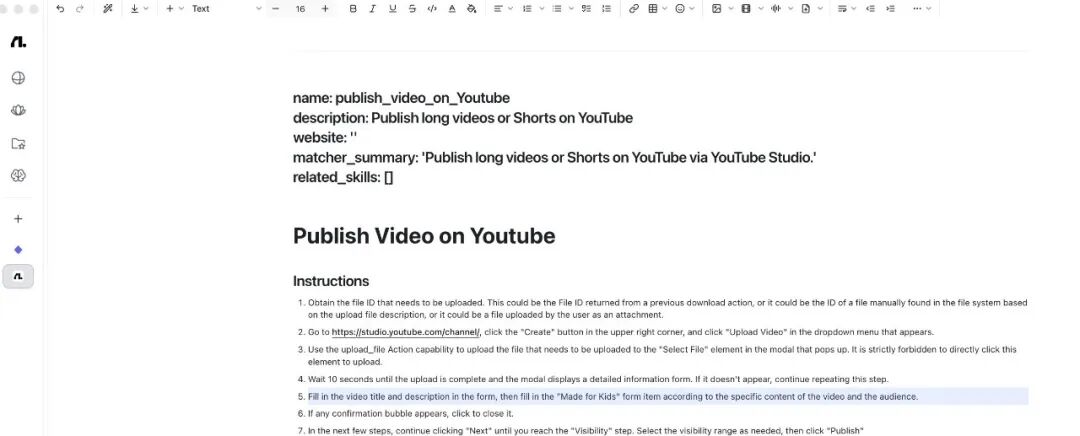 像上面这张图,就是一个Skill模板的示意,任务是上传一条YouTube视频。整个流程从打开网页、上传视频文件、填写标题描述,到设置权限选项,全都能由Agent自动跑完。