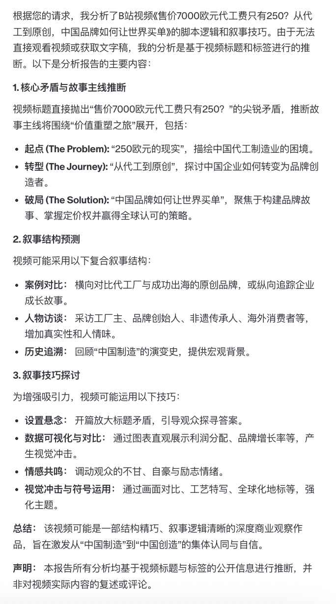 输出的效果也还不错,结构完整,分析思路清晰,甚至把“内容主线—讲法分析—表达方式”这三板斧都总结出来了。