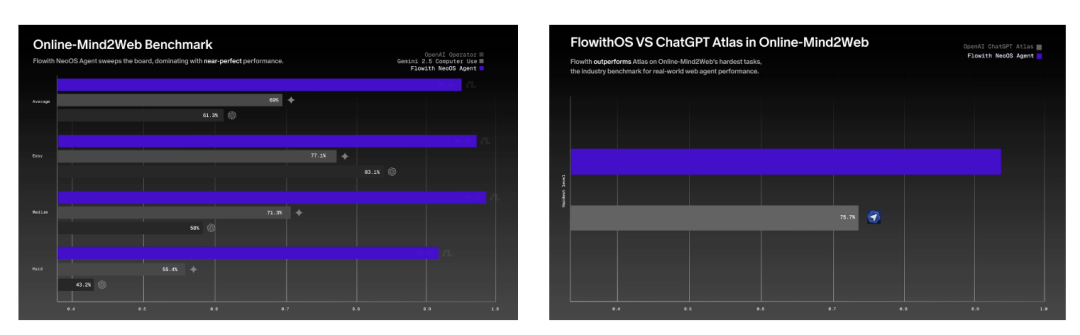 在Online-Mind2Web基准测试里,FlowithOS的综合测评甚至还把Gemini和Atlas都给比下去了: