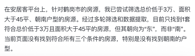我一时起了疑,决定亲自上安居客查一下,果然不到两分钟就找到了不止一套符合要求的朝南房源,条件比它给出的还更好。
