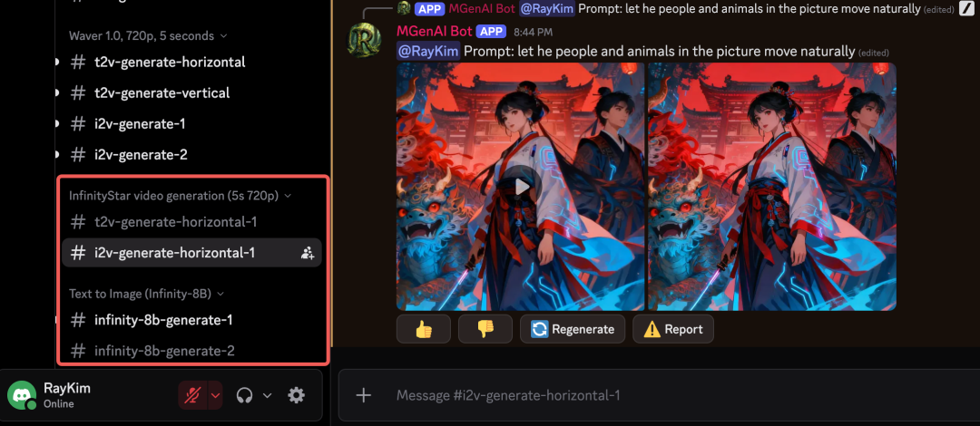 在左侧导航栏的下方面,便有InfinityStar文生视频、图生视频等各种功能的选项。像刚才展示的视频,便是在“i2v-generate-horizontal-1”中实现:
