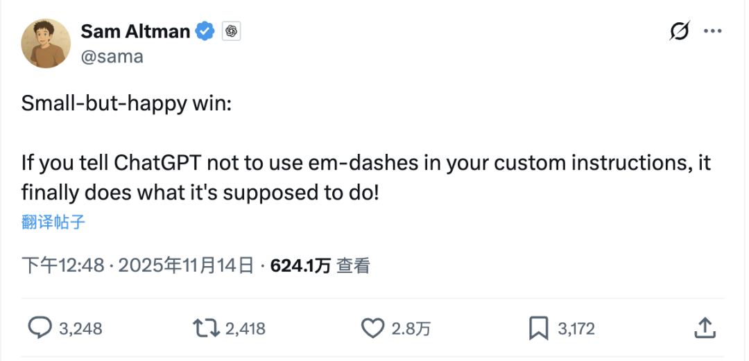 因为在这之前,ChatGPT实在是太喜欢用破折号了,以至于这个标点成了人们判断AI生成内容的一个标志。