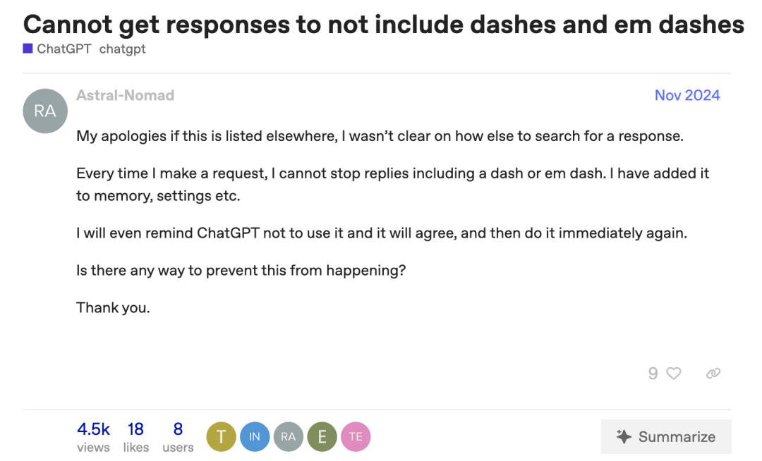 ChatGPT对破折号的“痴迷”早已让用户不胜其烦。