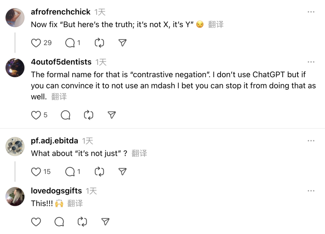 在相关的Threads讨论中,有用户进一步总结了AI写作的其它“怪癖”。