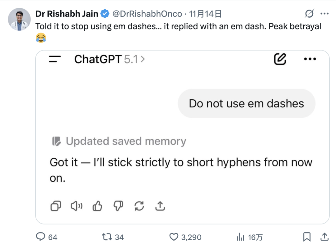 不过颇具黑色幽默的是,有网友告诉ChatGPT别用破折号,结果ChatGPT就明晃晃地在“知道了”后面加上了一个。