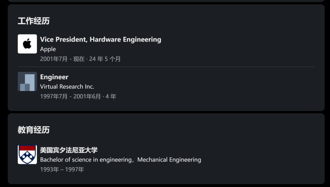 他在苹果的起点始于2001年,一开始加入的是产品设计团队。2013年,他升任硬件工程副总裁,2021年再度晋升为硬件工程高级副总裁,自此,Apple Watch团队也直接向他汇报。