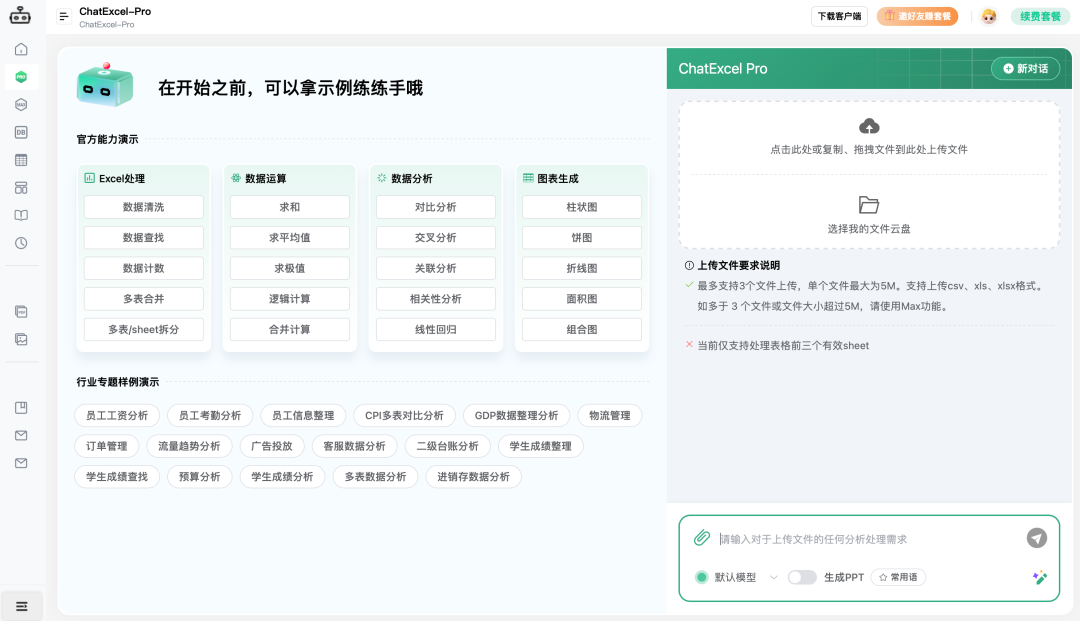智能对话交互与多模态数据输入输出:用户无需学习函数公式可上传多模态数据文件,如PDF、Word、PPT、图片等,通过自然语言与数据进行交互。提供系统支持对话式完成数据清洗、运算、分析到图表生成的全过程,并支持抠图、制表、多种模板选择功能,可将最终结果一键导出为Excel或直接生成数据PPT。