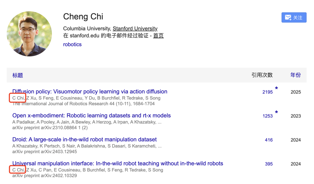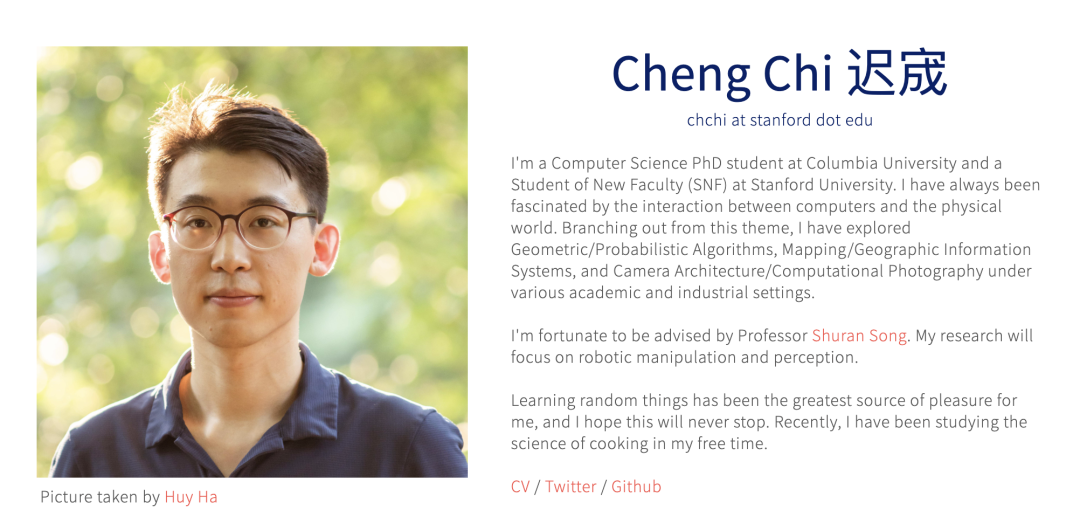 他不仅是UMI(Universal Manipulation Interface )、Diffusion policy的一作,同时也是具身数据集Open x-embodiment、Droid的贡献者之一。