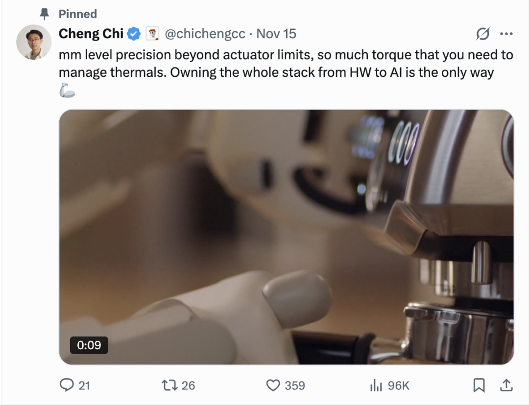 按发布时间顺序,在仅有的两条演示视频中,第一条是机器人操作全尺寸意式咖啡机,时长10秒。