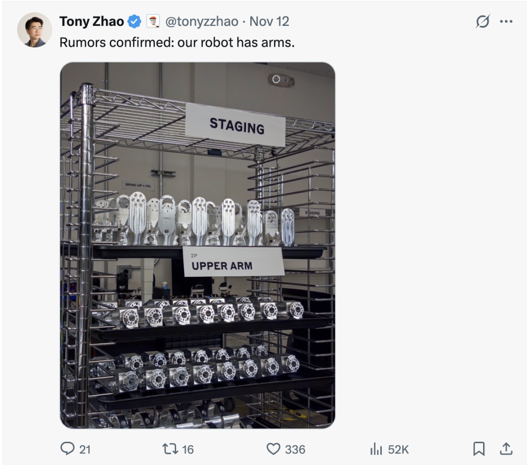 赵子豪也是在后续的帖文中证实了这一点:新机器人有手臂。