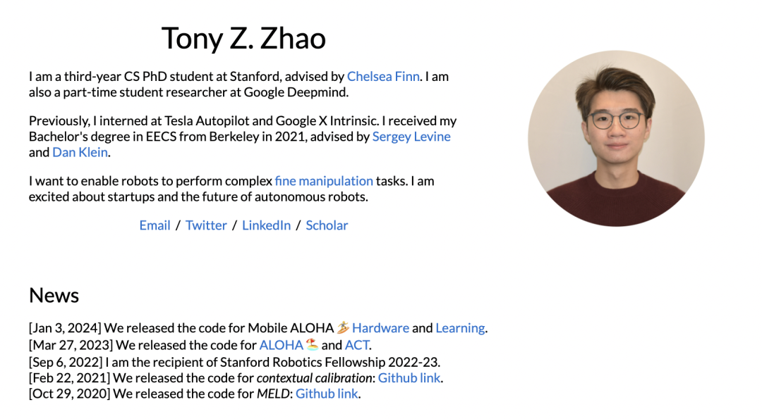 他不仅是ALOHA、ACT(Action Chunking with Transformers )、Mobile ALOHA等明星工作的核心作者,而且还是谷歌Open X-Embodiment数据集、手术机器人(Surgical Robot Transformer,SRT) 的贡献者之一。