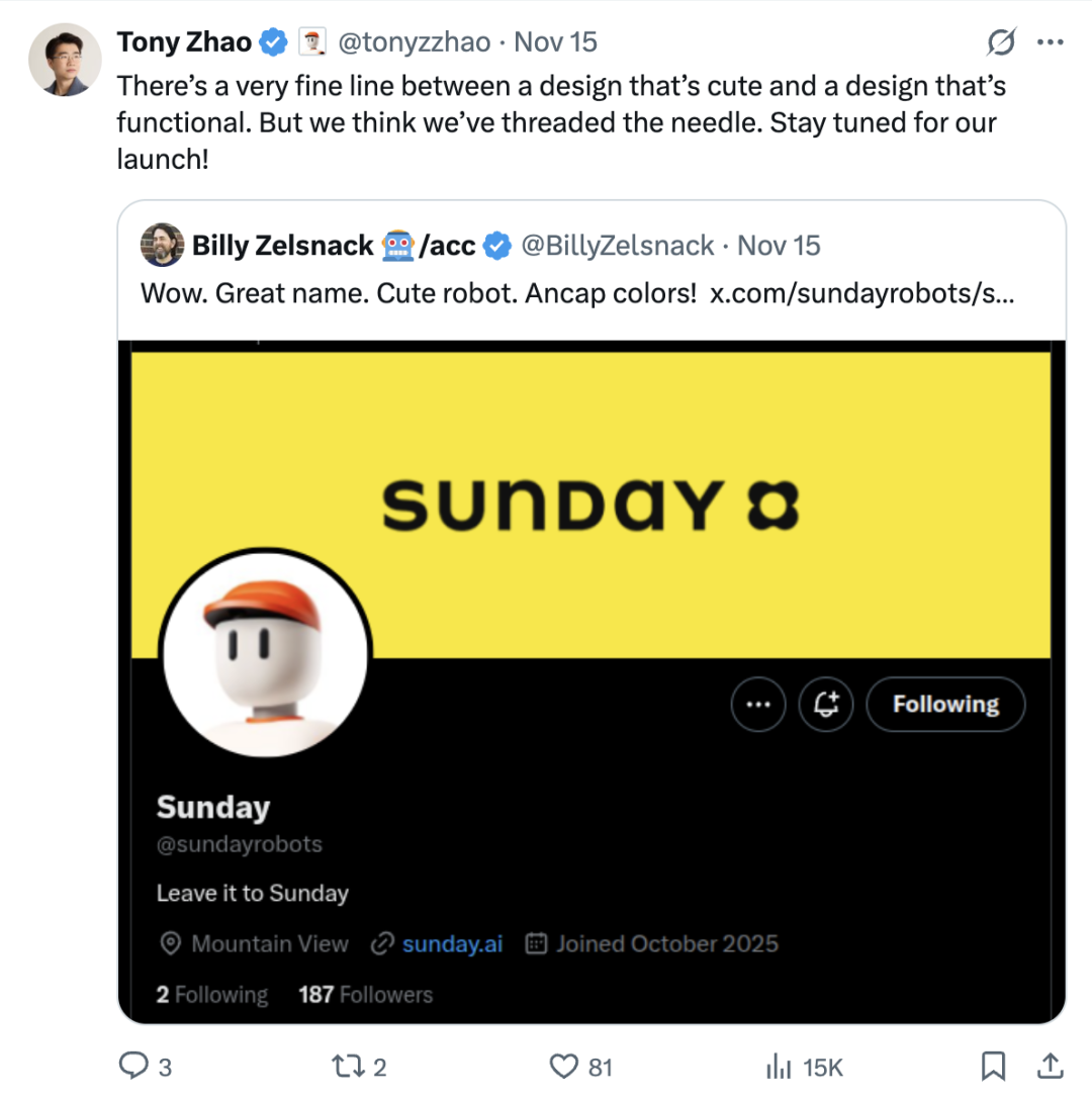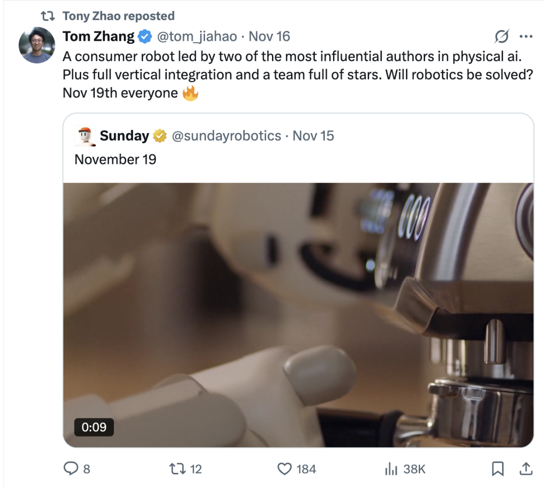斯坦福具身大佬赵子豪(Tony Zhao)与迟宬(Cheng Chi)联合创办的机器人公司Sunday于近日浮出水面,并宣布将于11月19日发布产品。