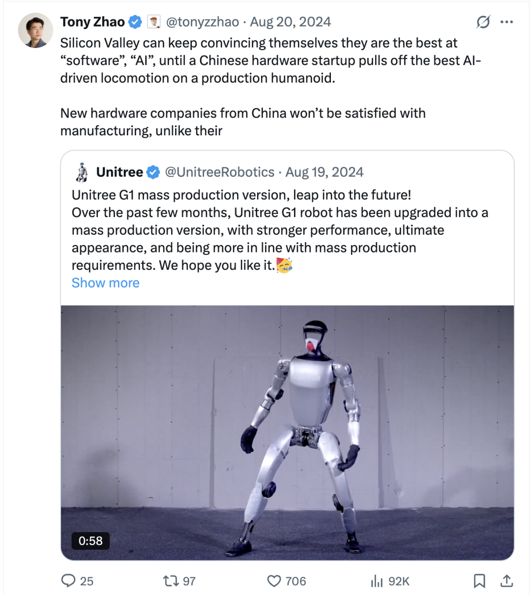 硅谷可以一直说服自己,他们在“软件”和“AI”方面是最强的,直到一家中国硬件创业公司在量产人形机器人上实现了最先进的AI驱动运动。来自中国的新兴硬件公司不会满足于仅仅做制造,和他们的前辈不同。他们想要纵向整合,打造出AI时代的iPhone和特斯拉。需要提醒的是,硅谷最初是从70年代的“低利润、高资本支出”硅产业起步的,这才造就了今天高利润、无限可扩展的软件生态系统。过去10年的软件繁荣是一个幸运,而非常态。如果硅谷继续抱有过于乐观的想法和错误的预设,其在具身AI的竞争中可能会失败。