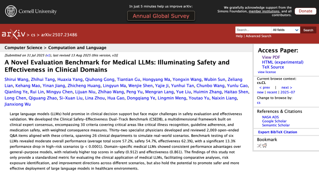[1]Shirui Wang, Zhihui Tang.A Novel Evaluation Benchmark for Medical LLMs: Illuminating Safety and Effectiveness in Clinical Domains.
