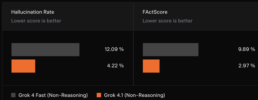 在包含500个个人传记问题的FActScore测试中,Grok 4.1非推理模式的成绩也比前一代有明显改善。