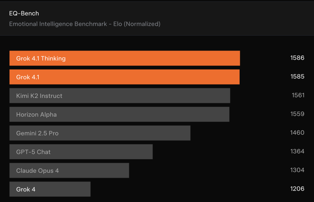 在非用户投票的EQ-Bench情商测试中,Grok 4.1的表现同样出色,超过刚发布不久的Kimi K2(但不是Thinking版本)。