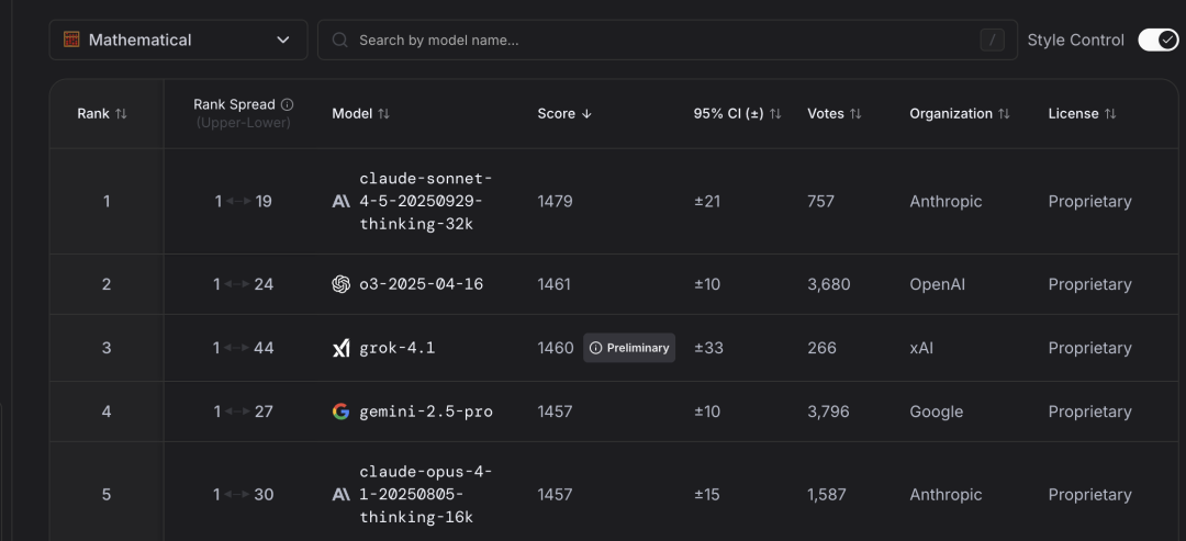 Grok4.1目前只在文学榜上输给Gemini2.5,数学榜输给Claude4.5和o3,其他六个榜单均拿下第一。