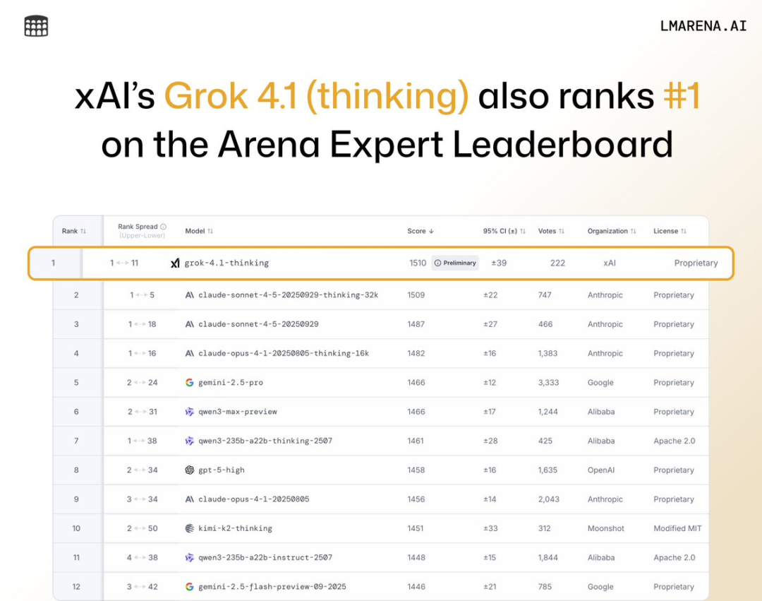 Grok 4.1非思考模式以1465分拿下第二名,超越了公开排行榜上所有其他模型的完整推理模式。