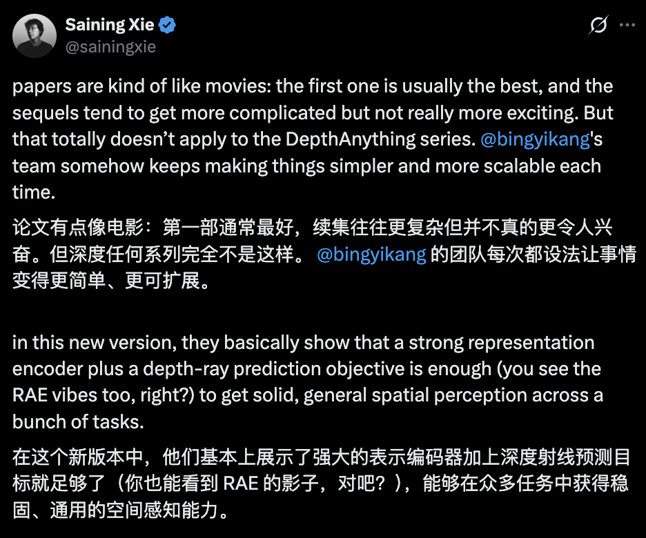 这是字节Seed康炳易团队带来的最新研究成果Depth Anything 3(下称DA3),获谢赛宁盛赞。