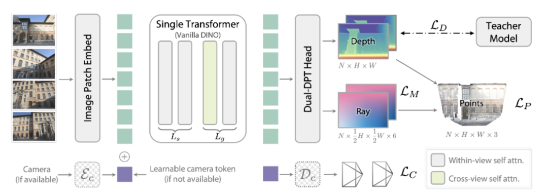 中间的Single Transformer (Vanilla DINO)是模型的核心大脑。它是基于预训练的DINO视觉Transformer,通过Within-view self attn单视角自注意力、Cross-view self attn跨视角自注意力两种注意力机制,让模型能在单图、多图、视频等不同输入形式下,自动打通视角间的信息关联。