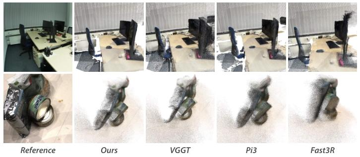 评测结果就是DA3全程能打。给一段视频,它能精准估计每帧的相机内参与外参,还原每帧相机的运动轨迹;