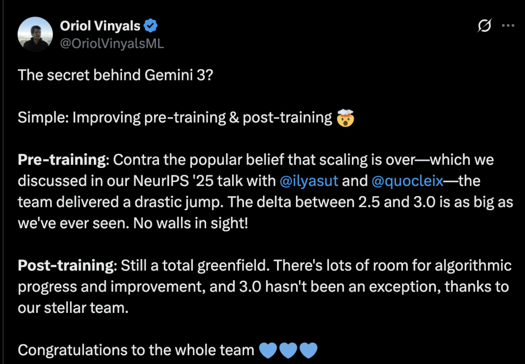 至于这么大的能力飞跃如何实现的,只有研究VP Oriol Vinyals透露了一点:预训练还没结束,后训练也还有很大改进空间。