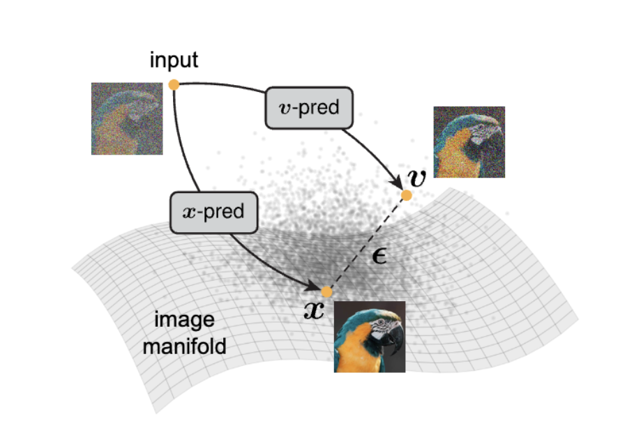 当下的主流扩散模型,虽然设计思想以及名为“去噪”,但在训练时,神经网络预测的目标往往并不是干净的图像,而是噪声, 或者是一个混合了图像与噪声的速度场。