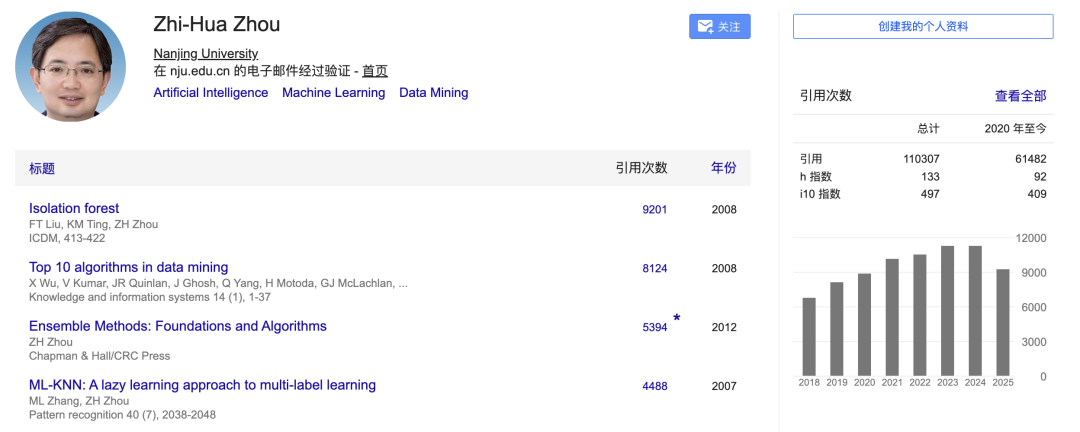 点开谷歌学术可以看到,周志华的论文被引数量超过11w次,h-index为133。