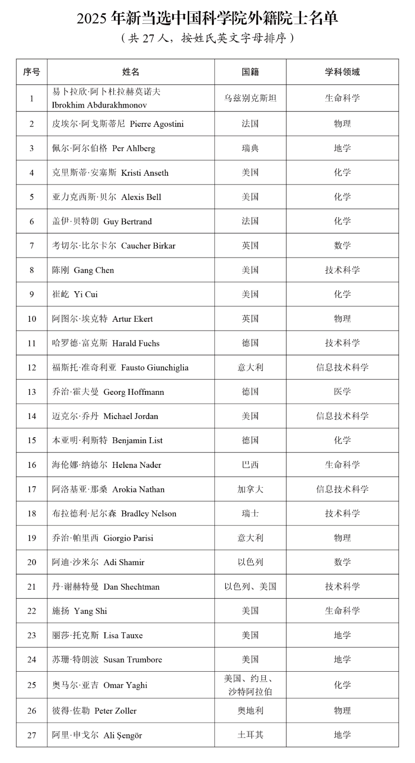与此同时,中国科学院新增外籍院士27人,中国工程院新增外籍院士24人。