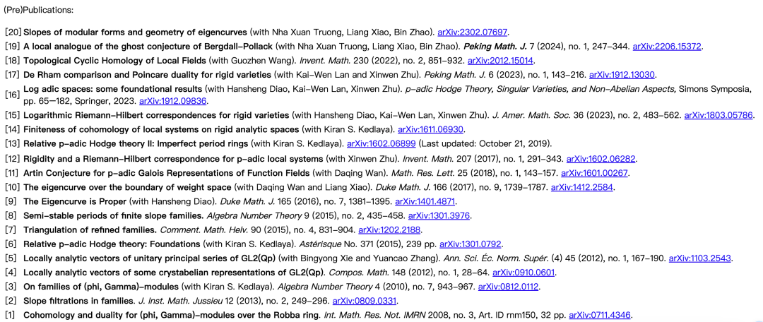 此前,他亦曾与朱歆文合作,利用他本人与Kedlaya合作发展的p进分析技术,对p进光滑刚性簇上的任意局部系统建立了Simpson函子,突破了Faltings工作中的small条件,并建立了黎曼希尔伯特函子。