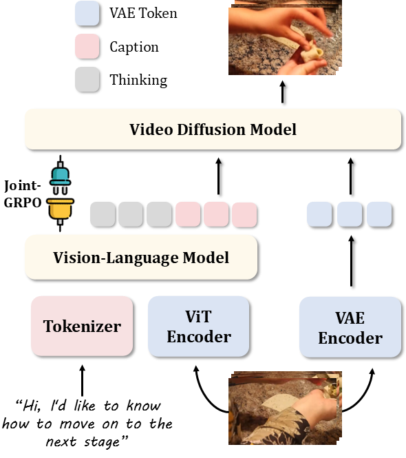1、感知与推理:输入视频首先被编码为视觉特征,与问题文本一同输入VLM。VLM的核心任务是进行思维链推理,最终生成一个描述下一事件的文本标题。