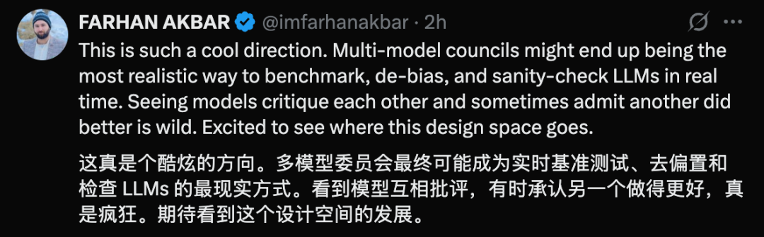 总的来说,卡帕西认为虽然模型内部自评不一定与人类主观一致,但类似的多模型集成或许将成为一个巨大的可探索空间,甚至可能成为未来LLM产品的一个突破点。