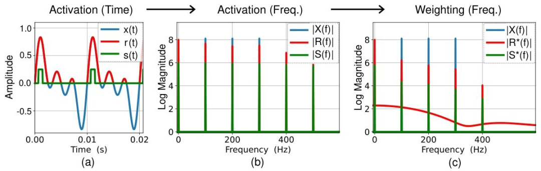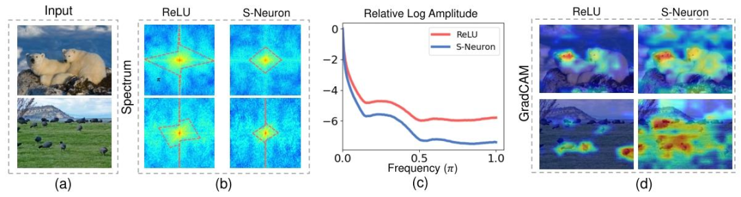 如上图所示,团队通过直观的傅里叶频谱分析表明,在“输入→激活→加权”的完整信息流中,与ReLU等传统激活函数会扩展信号的频率带宽不同,脉冲神经元会导致高频成分的快速消散(b-c),进而导致特征模糊(d)。