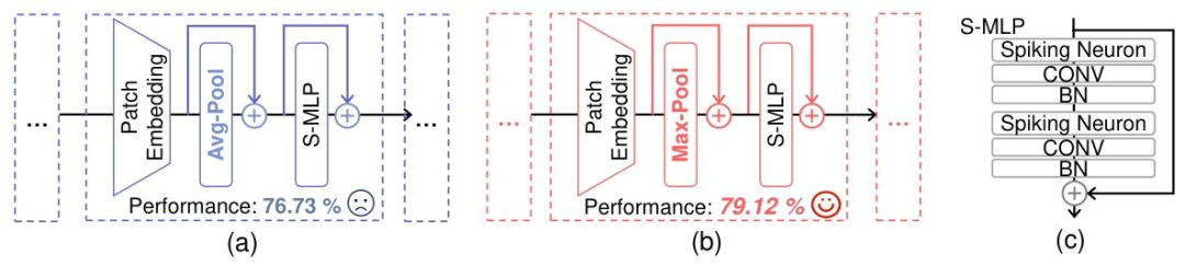 △使用平均池化和最大池化的脉冲Transformer架构示意图